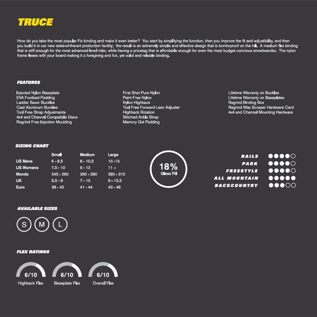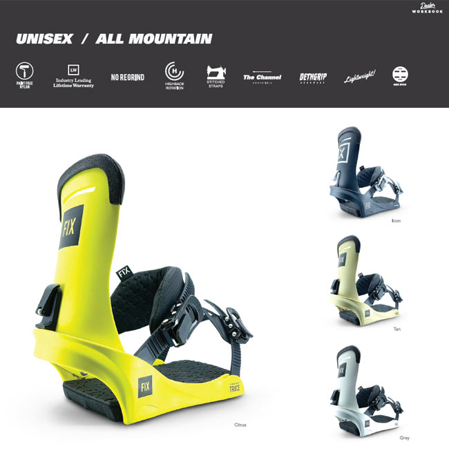 -------------------------------- -フレックス:3 MEDIUM -軽さ:4 ※硬さ(フレックス)5段階 1柔→5硬 / 軽さ5段階 1重→5軽 -ジャンル別:ジャンプ/パーク/フリーラン -------------------------------- 【FIX BINDING】 2015年カナダにて誕生したニューバインディングブランド。